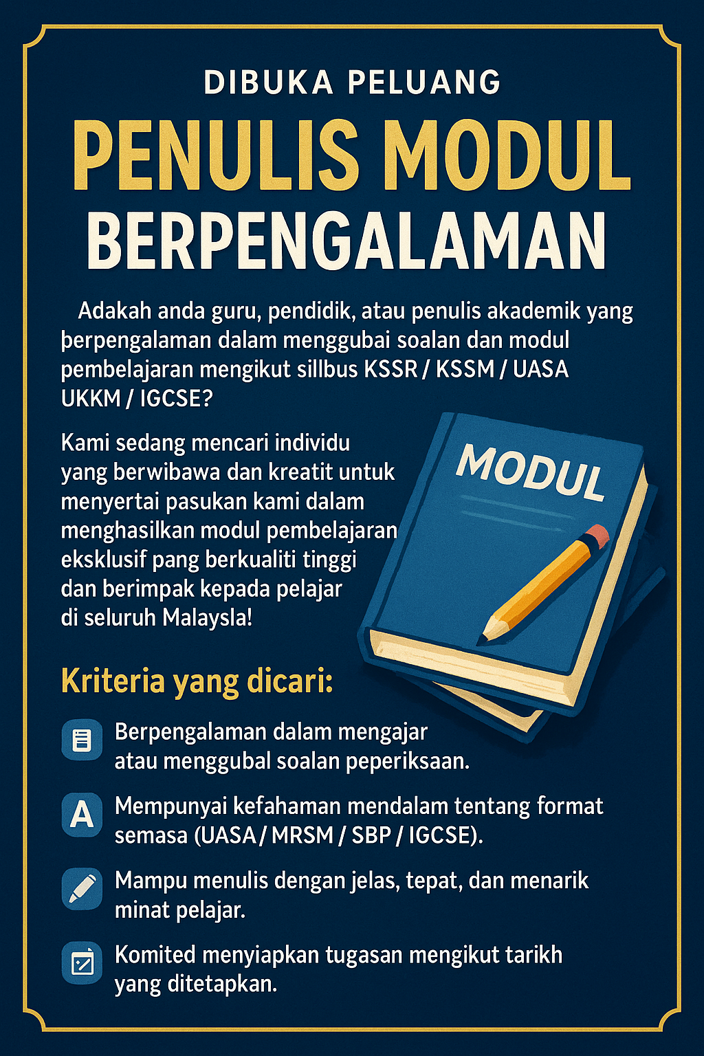 Hantar profil ringkas, sampel soalan, atau modul hasil penulisan anda ke:
